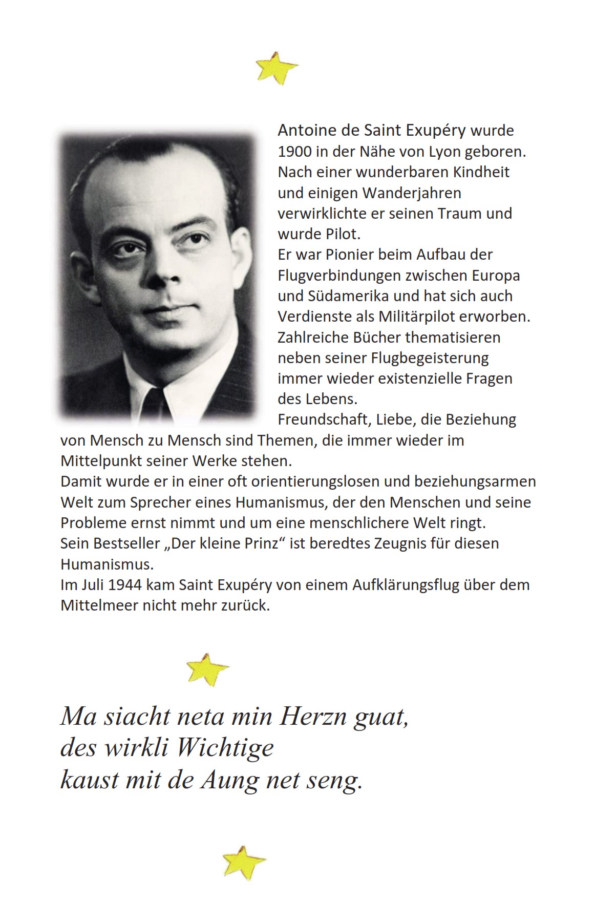Den kleinen Prinz kennen alle, zitieren alle und lieben alle. Das Buch ist Liebesgeschichte genauso wie Lebensphilosophie, und Zeitdiagnose genauso wie Zeitkritik. In der Mundart, der Sprache des Herzens, gewinnen die Texte Exupérys eine besondere Emotionalität und Tiefe, die in der Hochsprache kaum möglich ist. Die herzergreifende Freundschaft des kleinen Prinzen mit dem Fuchs etwa schreit förmlich nach dieser Sprache des Herzens.