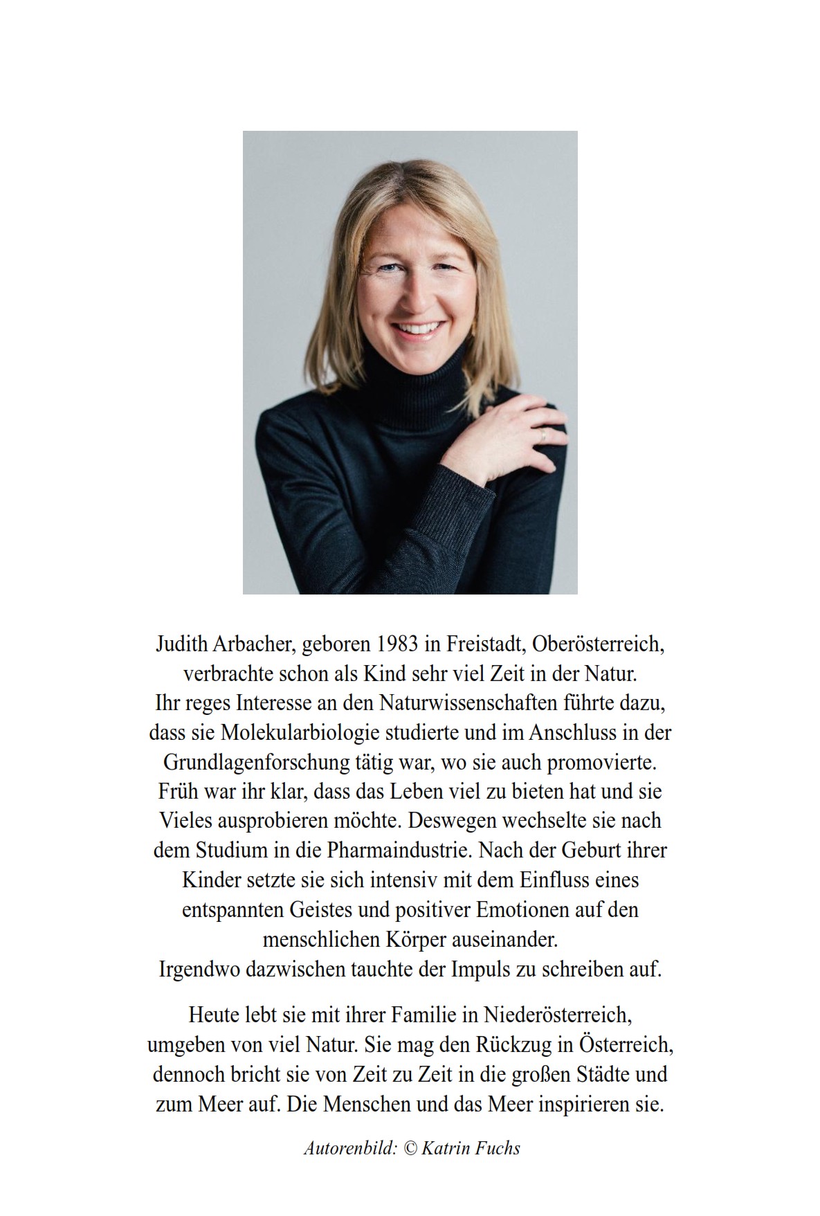 Judith Arbacher, geboren 1983 in Freistadt, Oberösterreich, verbrachte schon als Kind sehr viel Zeit in der Natur. Ihr reges Interesse an den Naturwissenschaften führte dazu, dass sie Molekularbiologie studierte und im Anschluss in der Grundlagenforschung tätig war, wo sie auch promovierte. Früh war ihr klar, dass das Leben viel zu bieten hat und sie Vieles ausprobieren möchte. Deswegen wechselte sie nach dem Studium in die Pharmaindustrie. Nach der Geburt ihrer Kinder setzte sie sich intensiv mit dem Einfluss eines entspannten Geistes und positiver Emotionen auf den menschlichen Körper auseinander. Irgendwo dazwischen tauchte der Impuls zu schreiben auf. Heute lebt sie mit ihrer Familie in Niederösterreich, umgeben von viel Natur. Sie mag den Rückzug in Österreich, dennoch bricht sie von Zeit zu Zeit in die großen Städte und zum Meer auf. Die Menschen und das Meer inspirieren sie.
