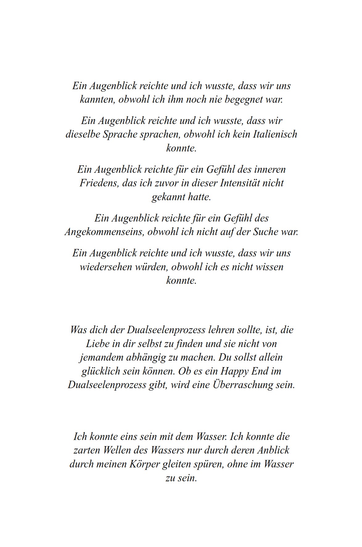 Ich konnte eins sein mit dem Wasser. Ich konnte die zarten Wellen des Wassers nur durch deren Anblick durch meinen Körper gleiten spüren, ohne im Wasser zu sein.