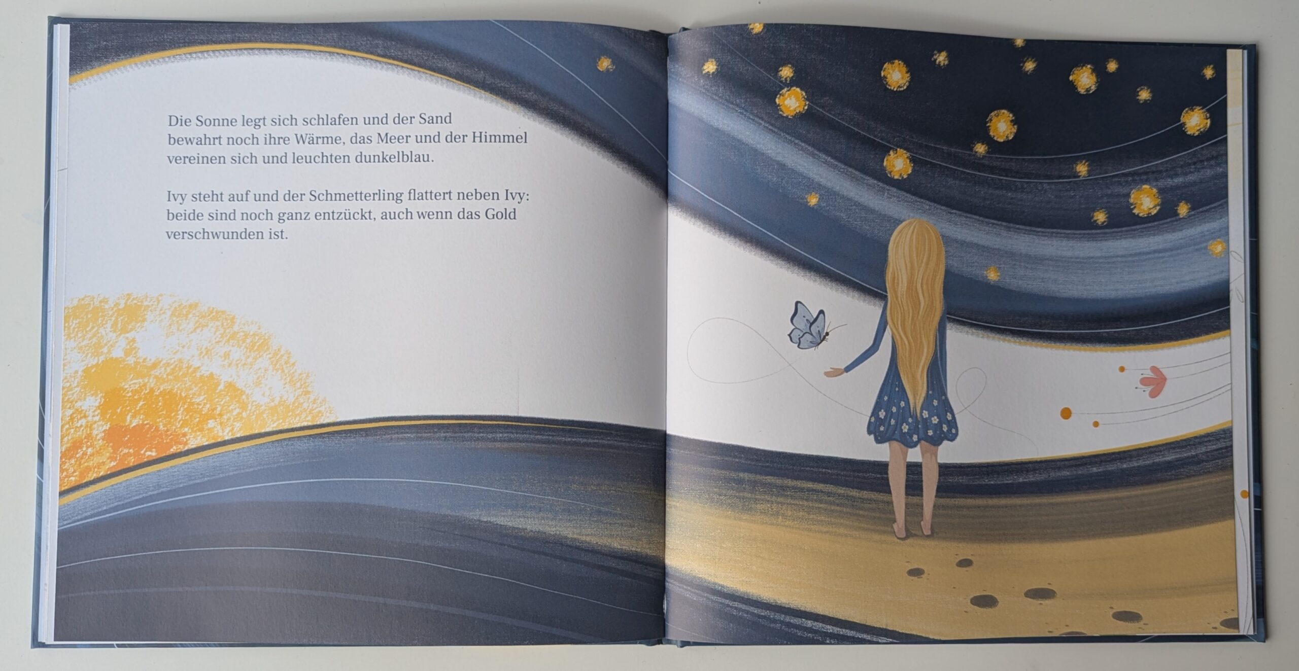 „Der warme nasse Sand unter ihren zarten Füßchen ist wie klebriger Lehm, die spitzen Muschelstückchen stechen wie Dornen in die zarte Haut, doch Ivy merkt nichts davon: sie läuft und läuft, und das blaue Kleid mit den gelben weichen Blumen fliegt im Wind, die blonden langen Haare wirbeln durch die Luft.“